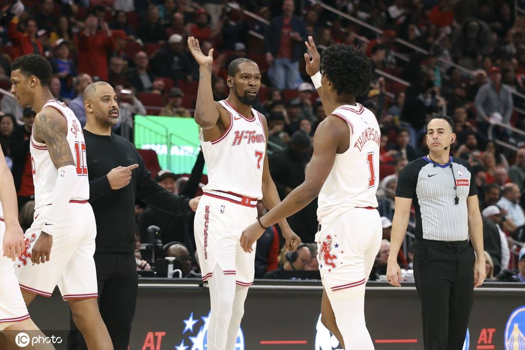 火箭队首发:阿门-汤普森、凯文-杜兰特、阿尔佩伦-申京、塔里-伊森、小贾巴里-史密斯